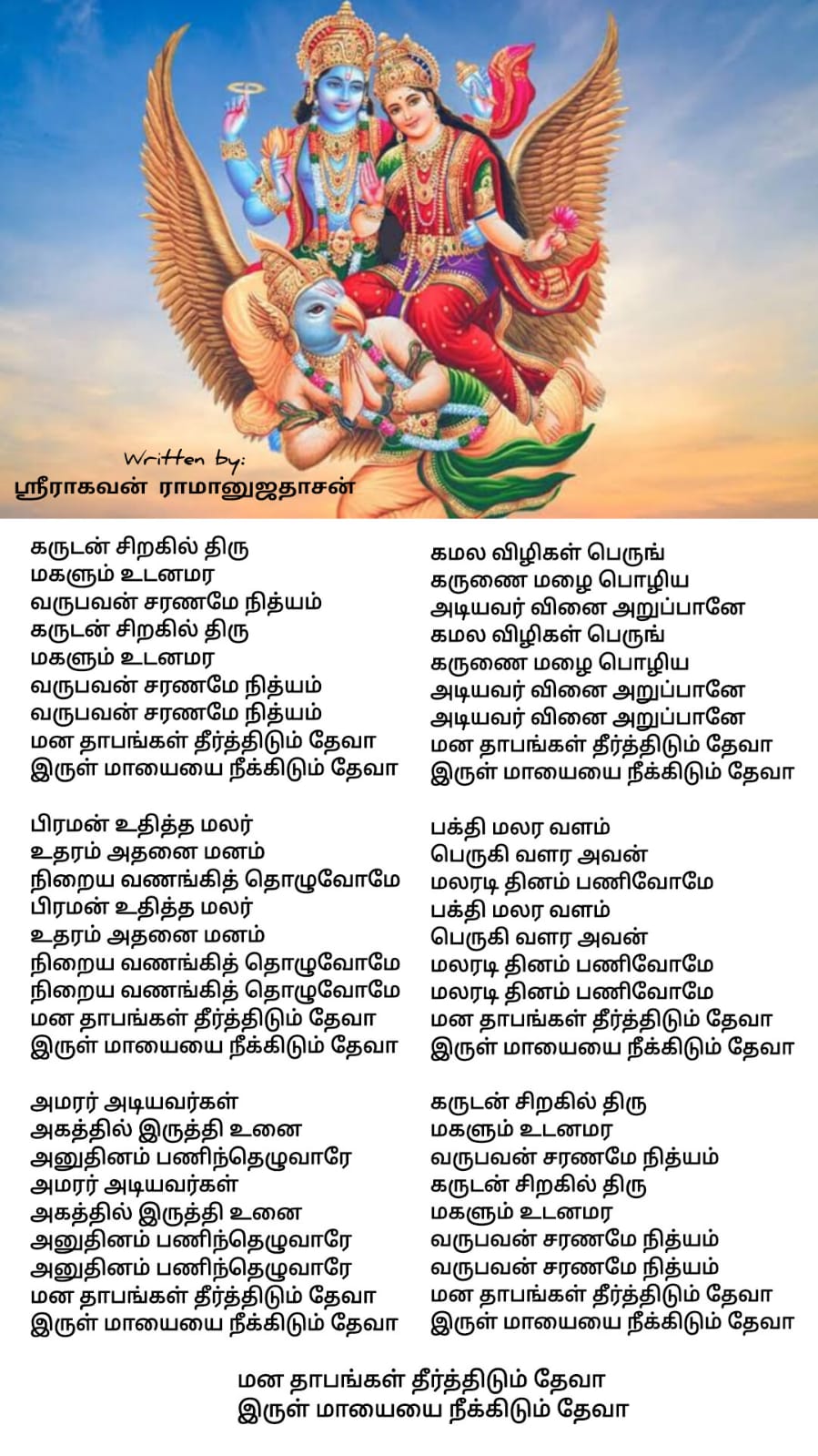 Originally composed by Jagadguru Sri Bharati Tirtha Mahaswamiji, this Maha Vishnu Slokam was interpreted into Tamil by one of the Sri. Ramanuja Society members, Sri. Raghavan Ramanujadasan. It also follows the original tune of Garuda Gamana Deva (click here to listen to the original tune).
