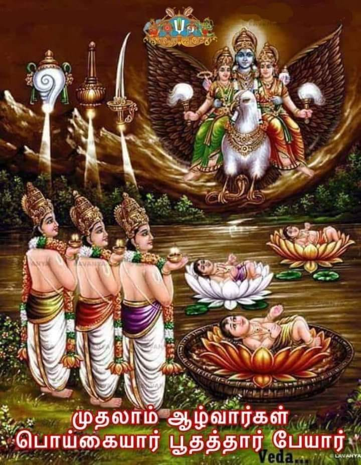 The Mudhal Azhvargal, Poigai Azhvar, Bhoothathazhvar, and Payazhvar, are revered as the first three Azhvars, the earliest saints of the Sri Vaishnava tradition. They were born on three consecutive days in the Siddharti year, Aippasi month. Unlike ordinary births, they divine beings emerged miraculously from flowers, and are therefore called Ayonjiyas, those not born from a womb.