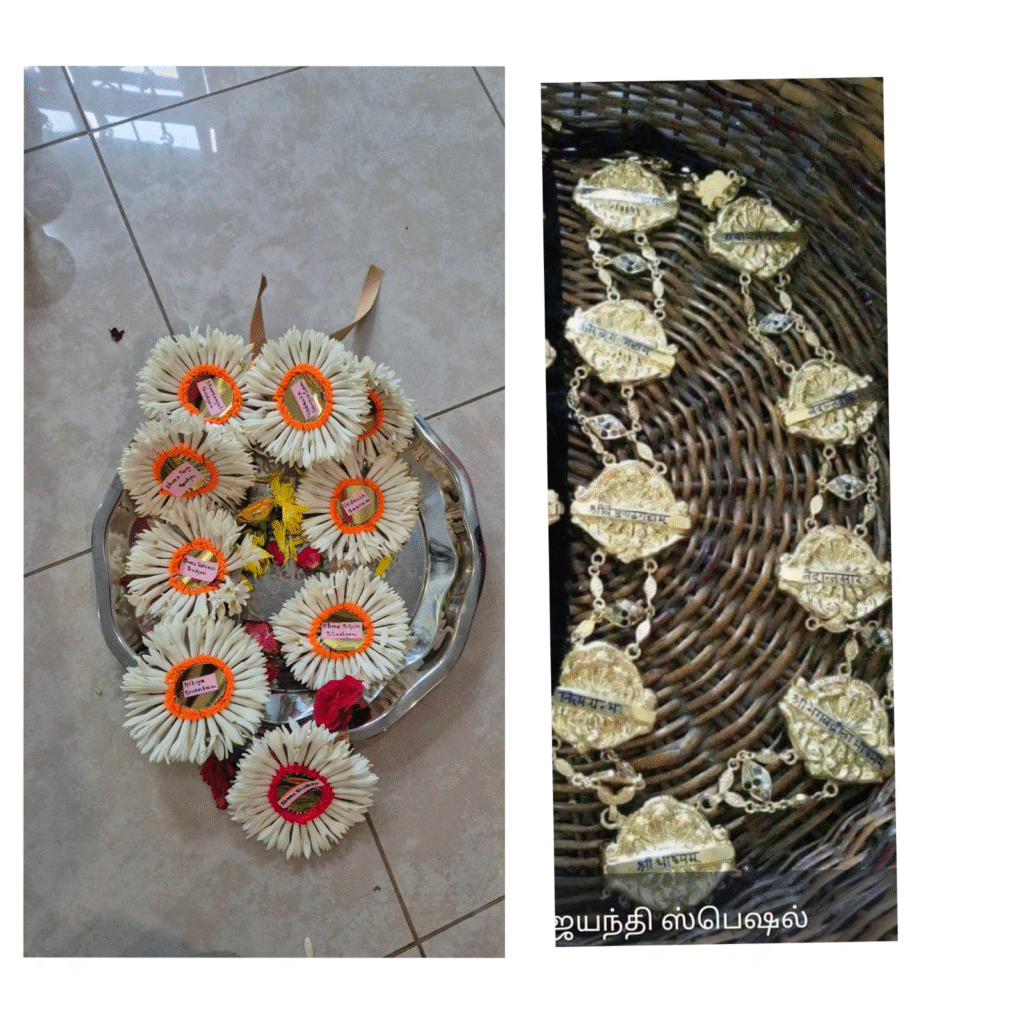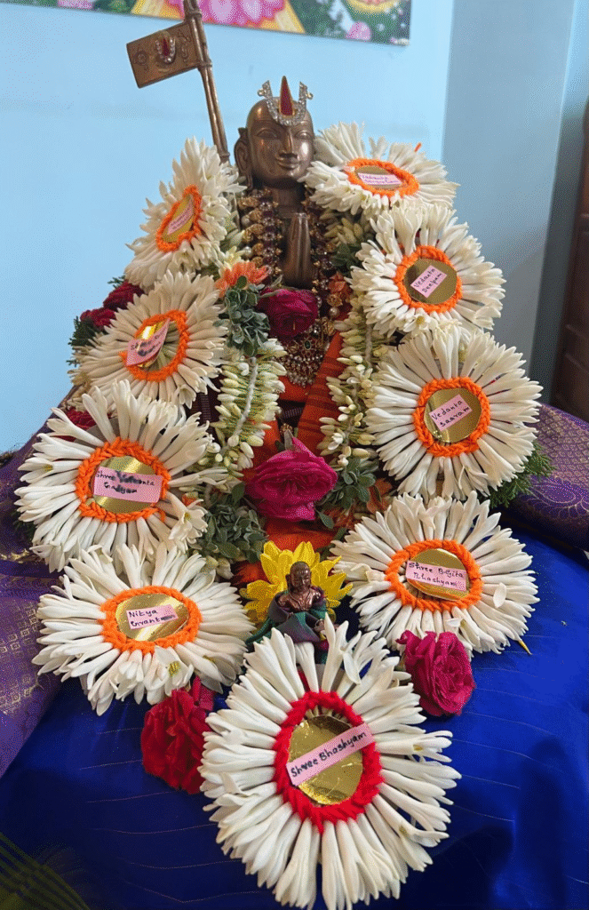 In a parallel act of devotion, Smt. Sumithra Sarangan, Sri Sarangan and Sow. Sharanya offered a beautiful pushpa haaram — lovingly strung with fresh, fragrant flowers — to the vigraham of Sri Ramanujar installed by NAMA.
