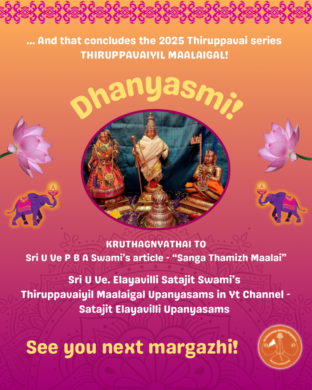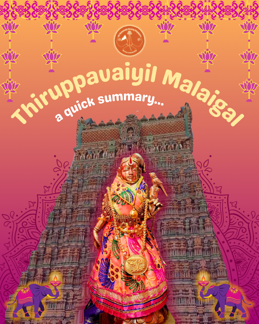 With the blessings of Sri Kodhai Piratti, we reflect upon the journey of Thiruppāvai, each pasuram, its mālai, and the divine sambandham it unfolds. Shared with love, koodi irunthu kulirndhu, by Sri Ramanuja Society Singapore.
